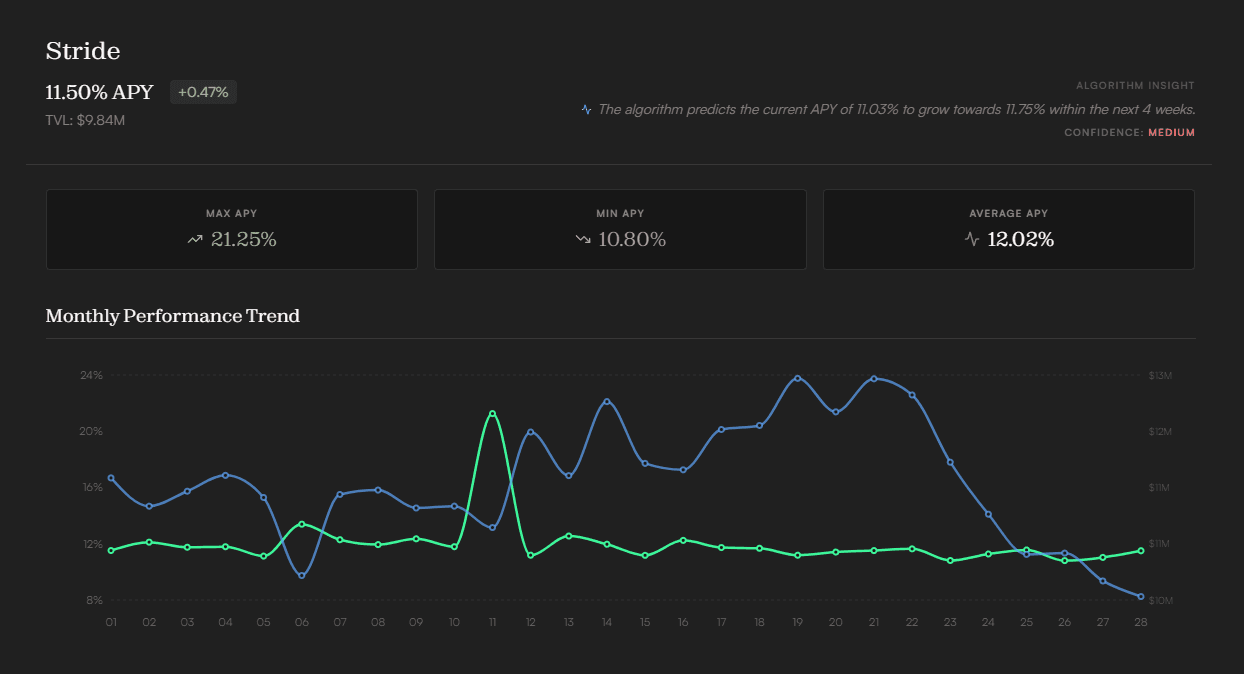 The algorithm analyzes historical data and current trends to estimate how APY levels could evolve in the coming weeks.